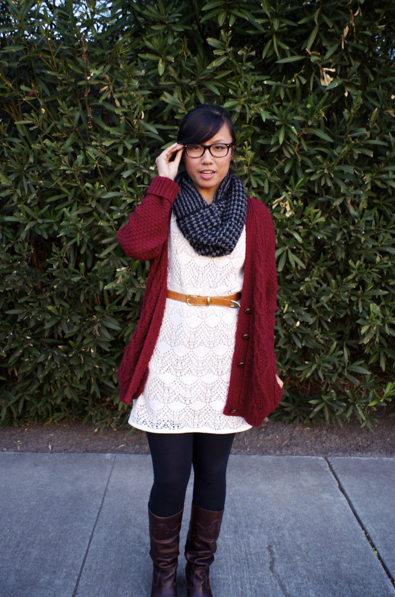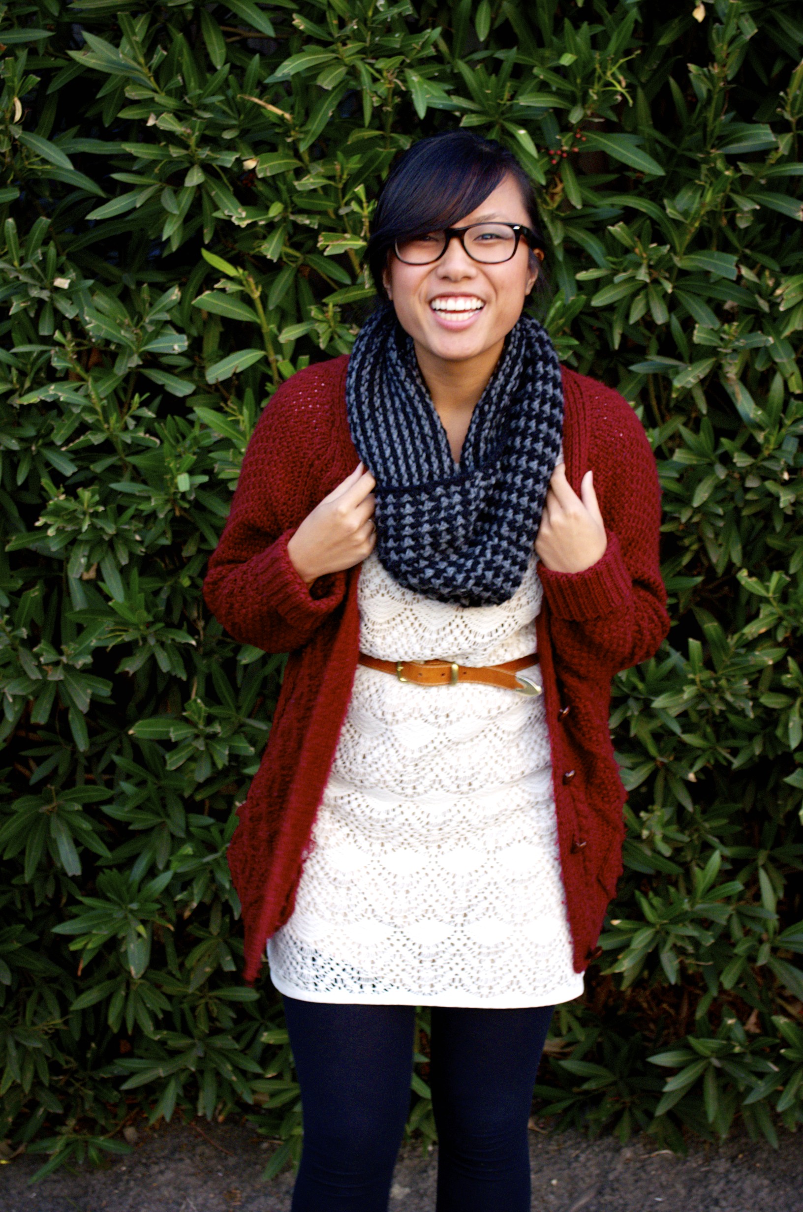 Got a summer/spring dress that you still aren’t sick of wearing, despite the cold weather? THAT’S OK. Throw on a pair of black tights, a chunky sweater, a scarf, boots and you’re good to go!