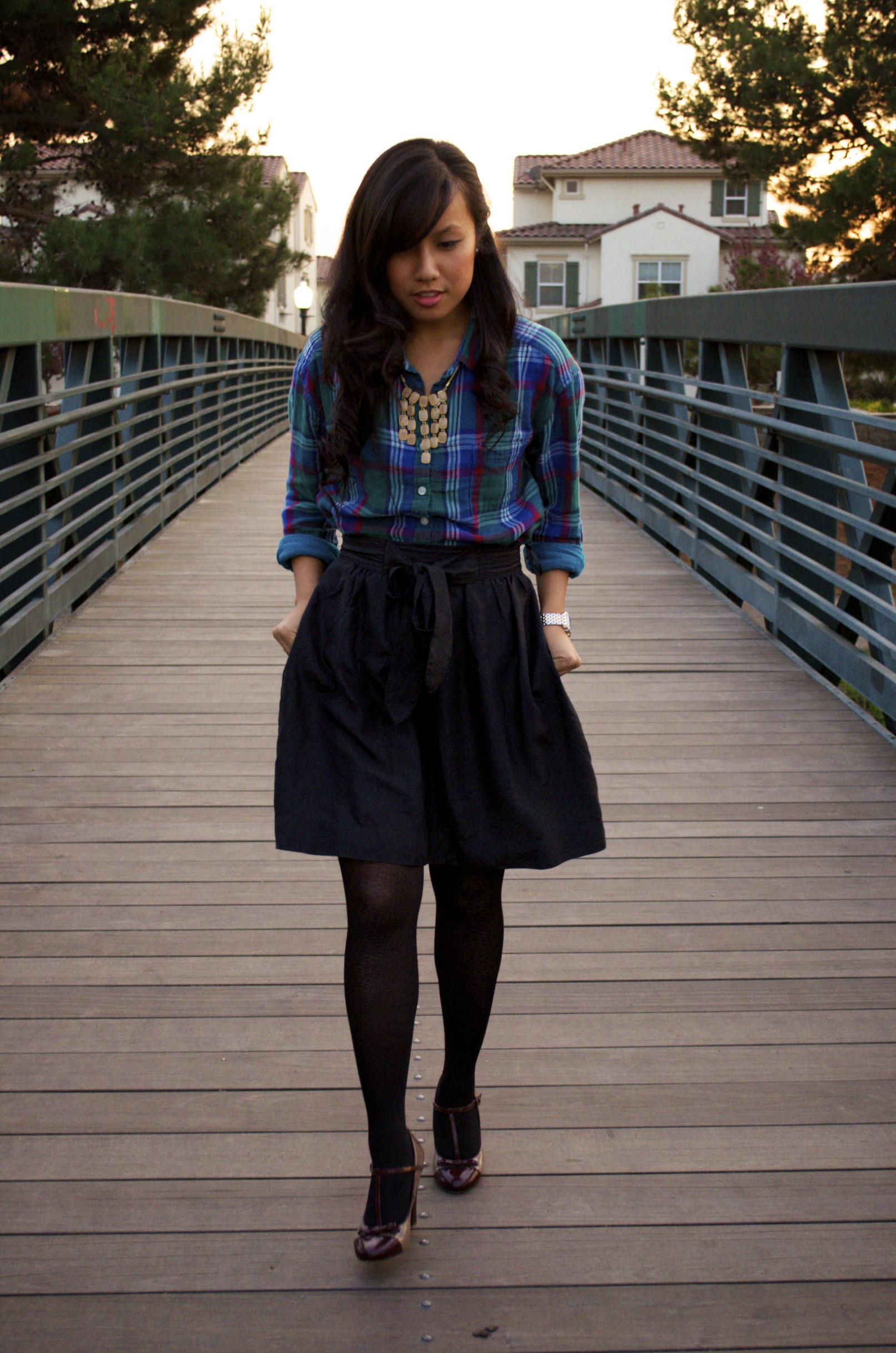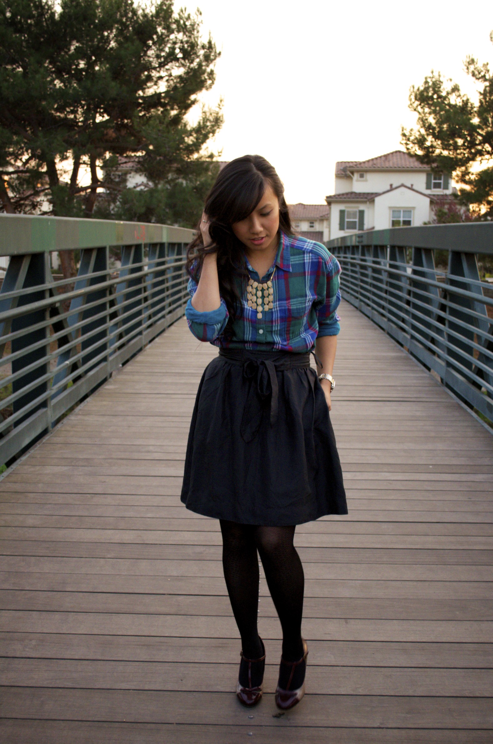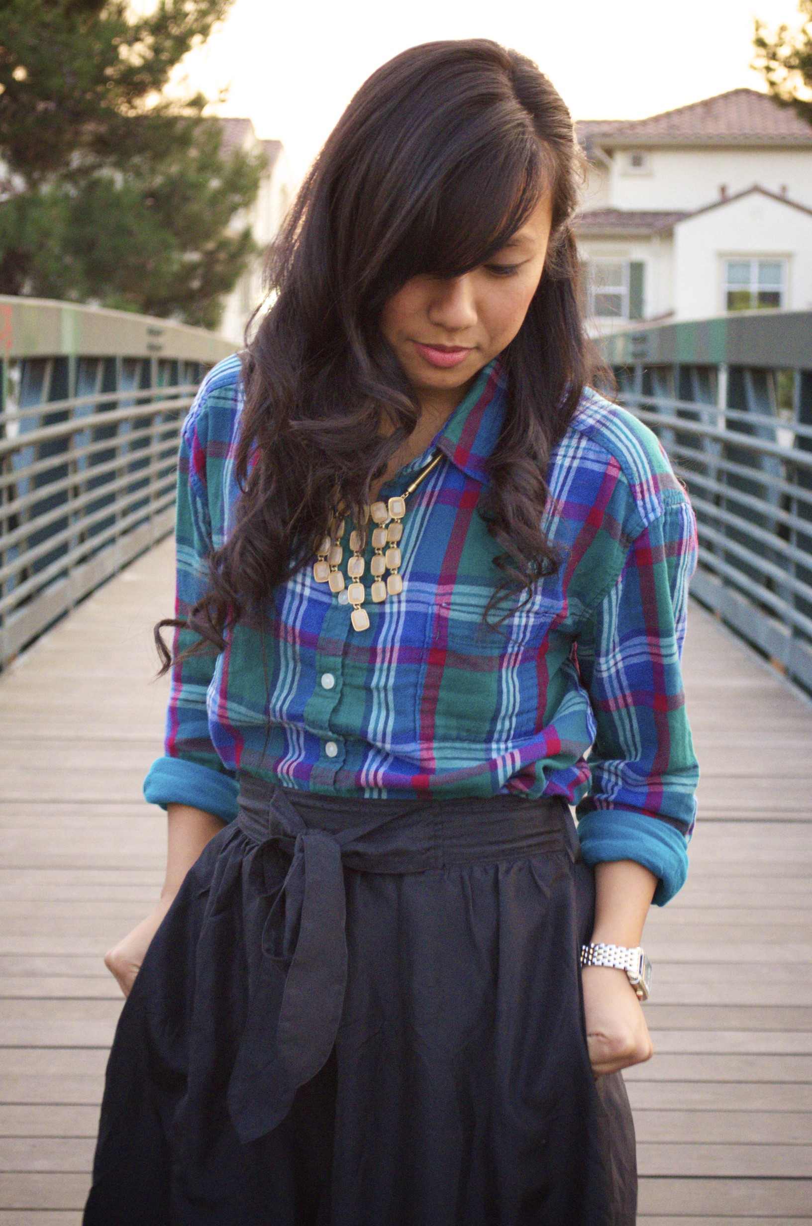 Cute outfit! Love the plaid and the black combo. The skirt is really cute and so is the necklace! thanks for sharing 🙂