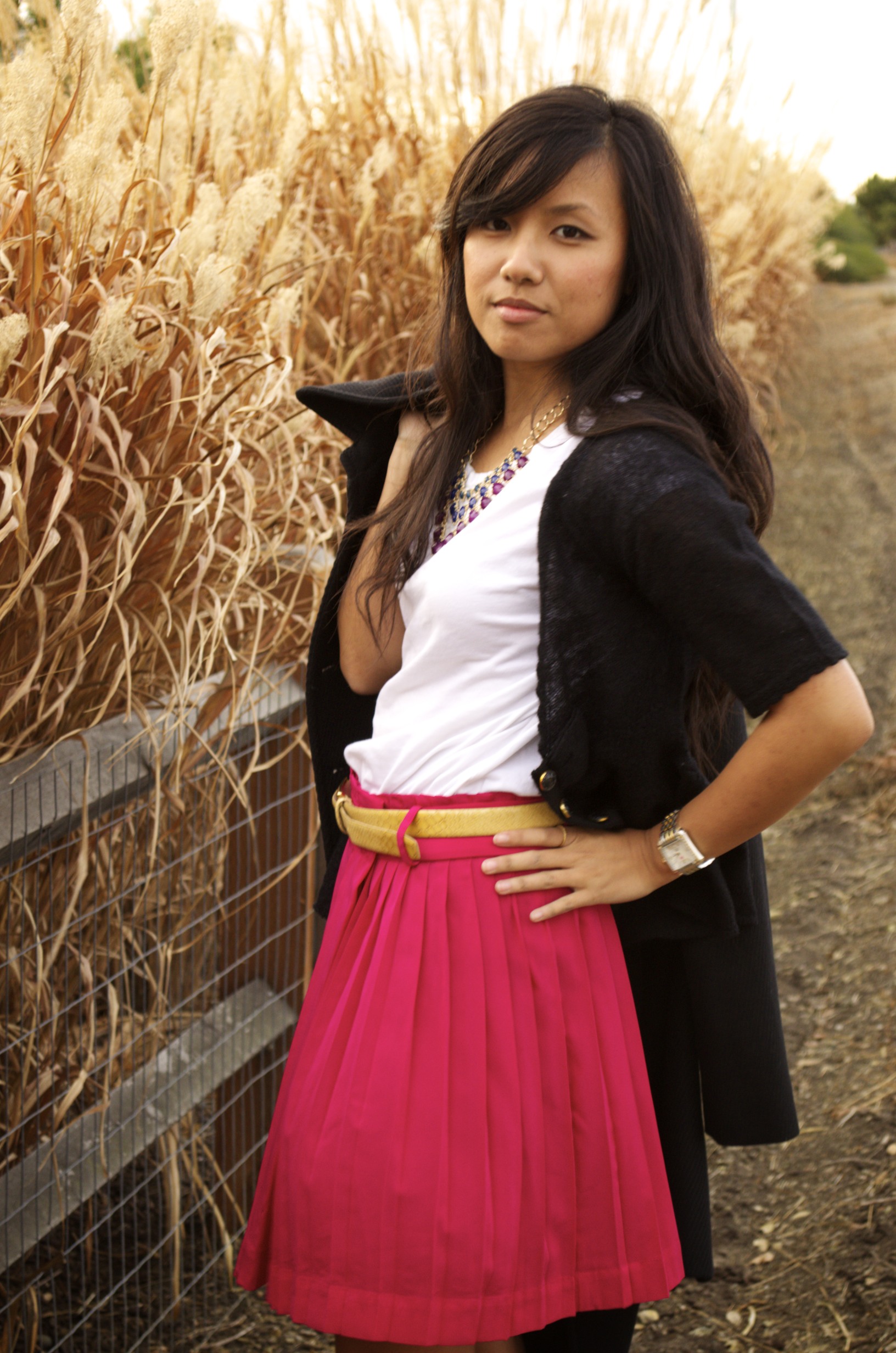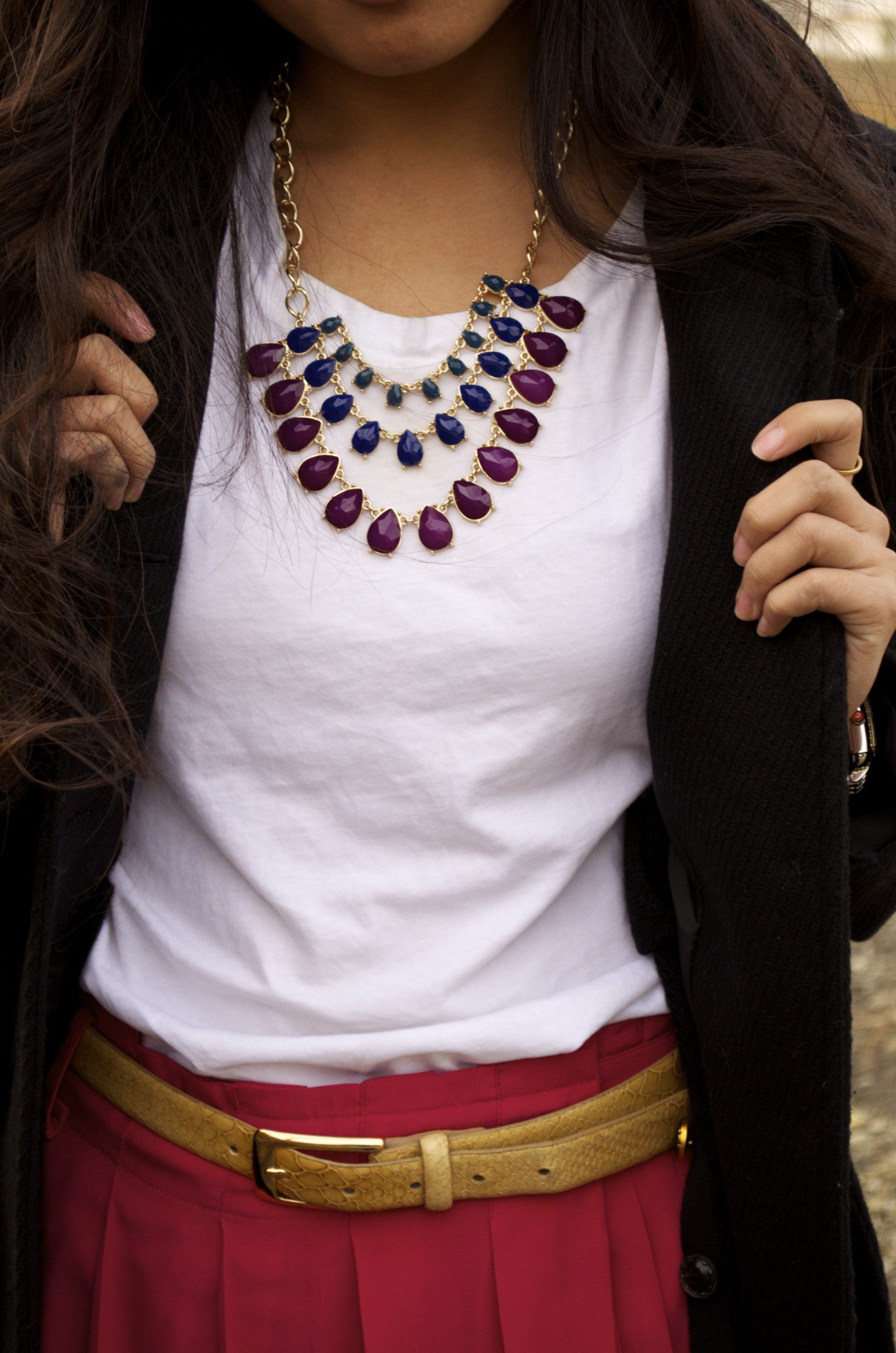 The Fix: Just throw on a skirt that POPS, heels, and a statement necklace, and make it a day.