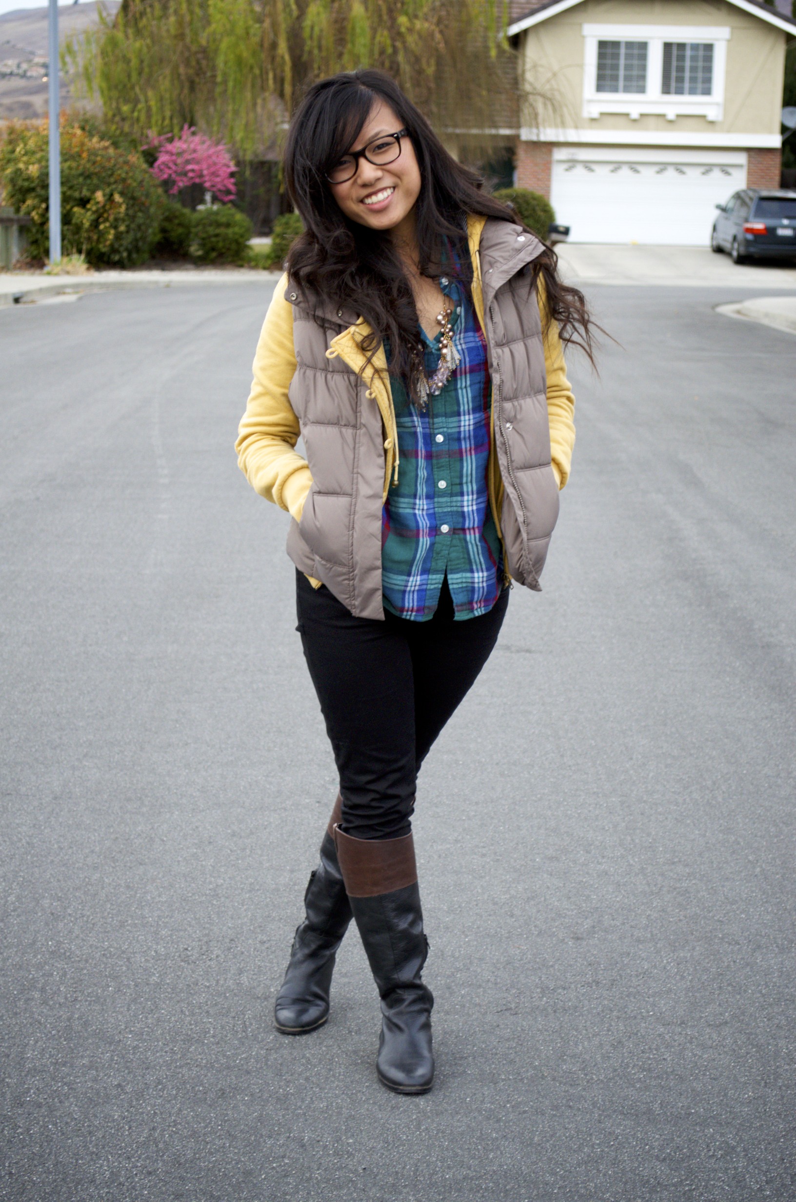 I love the vest over the plaid, so cute!