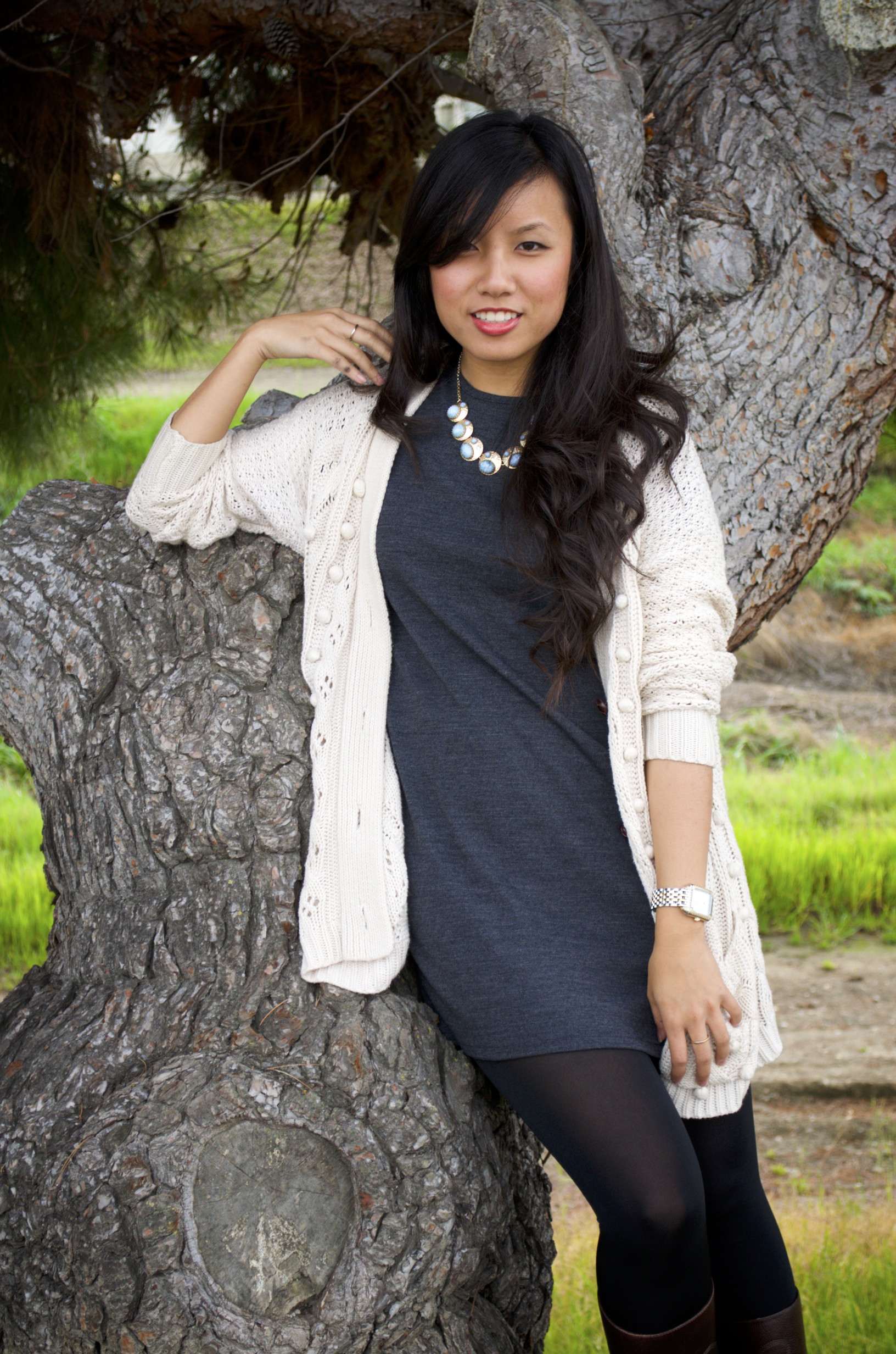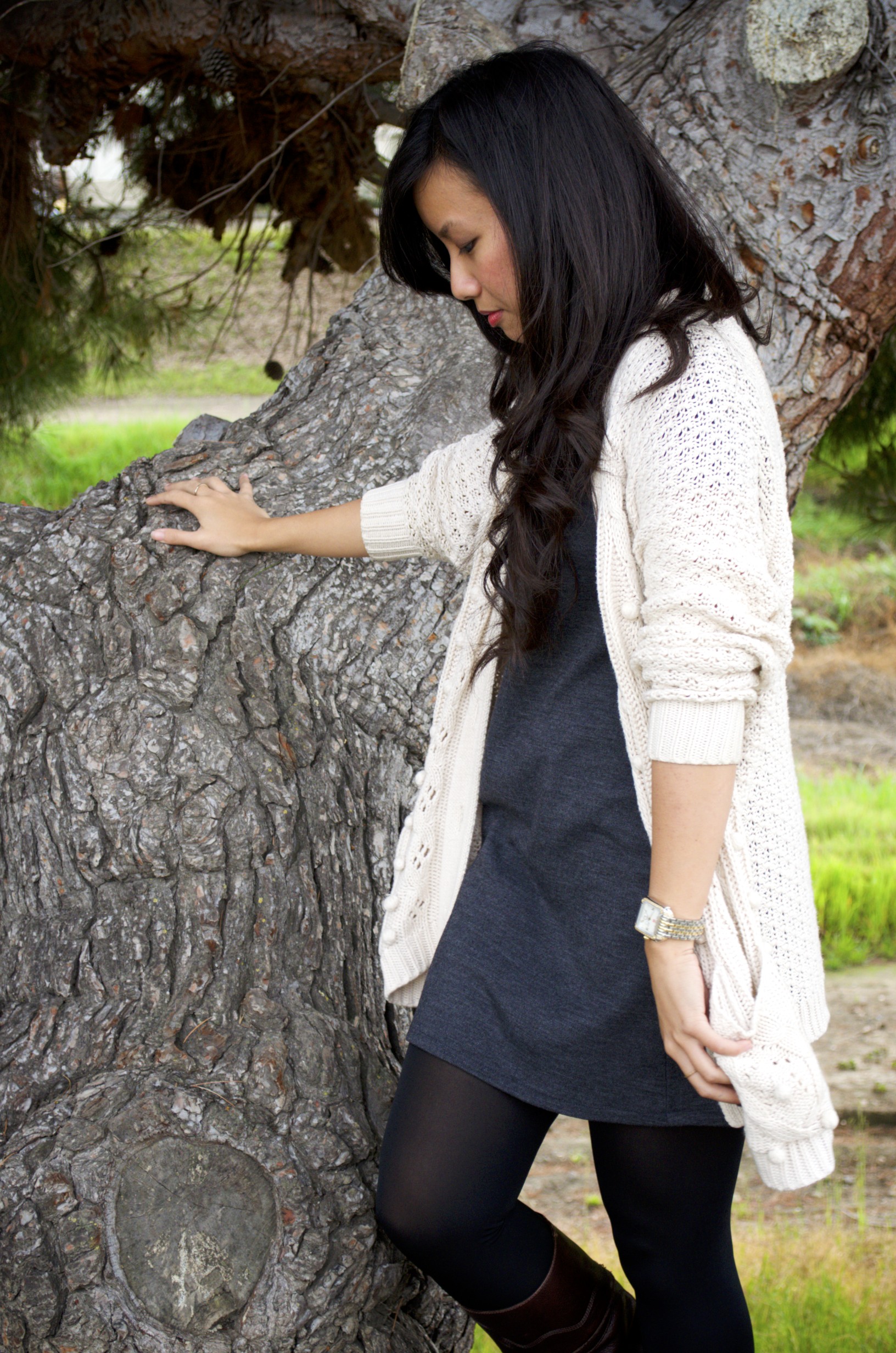 Well, I just thrifted this and so I don’t think I would consider it my favorite yet, but I do REALLY like this dress so I just HAD to style it for this week. It’s just a simple grey knit dress and I just wanted to keep it just that. Threw on a sweater, tights, and boots because it was cold and added a touch of bling to dress it up a bit. Simply comfortable.