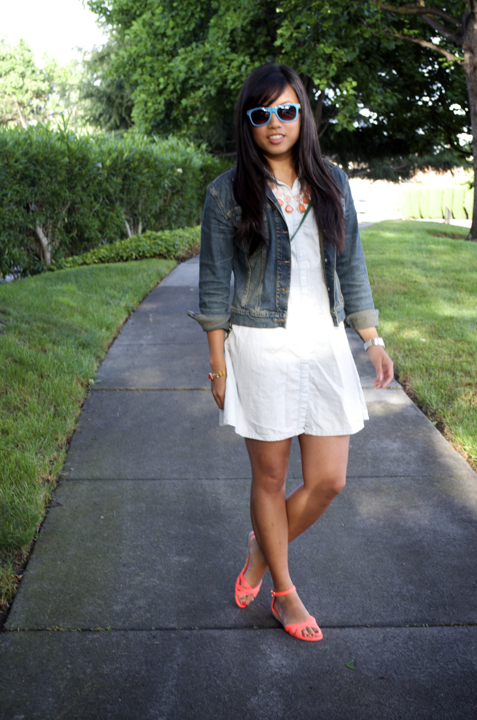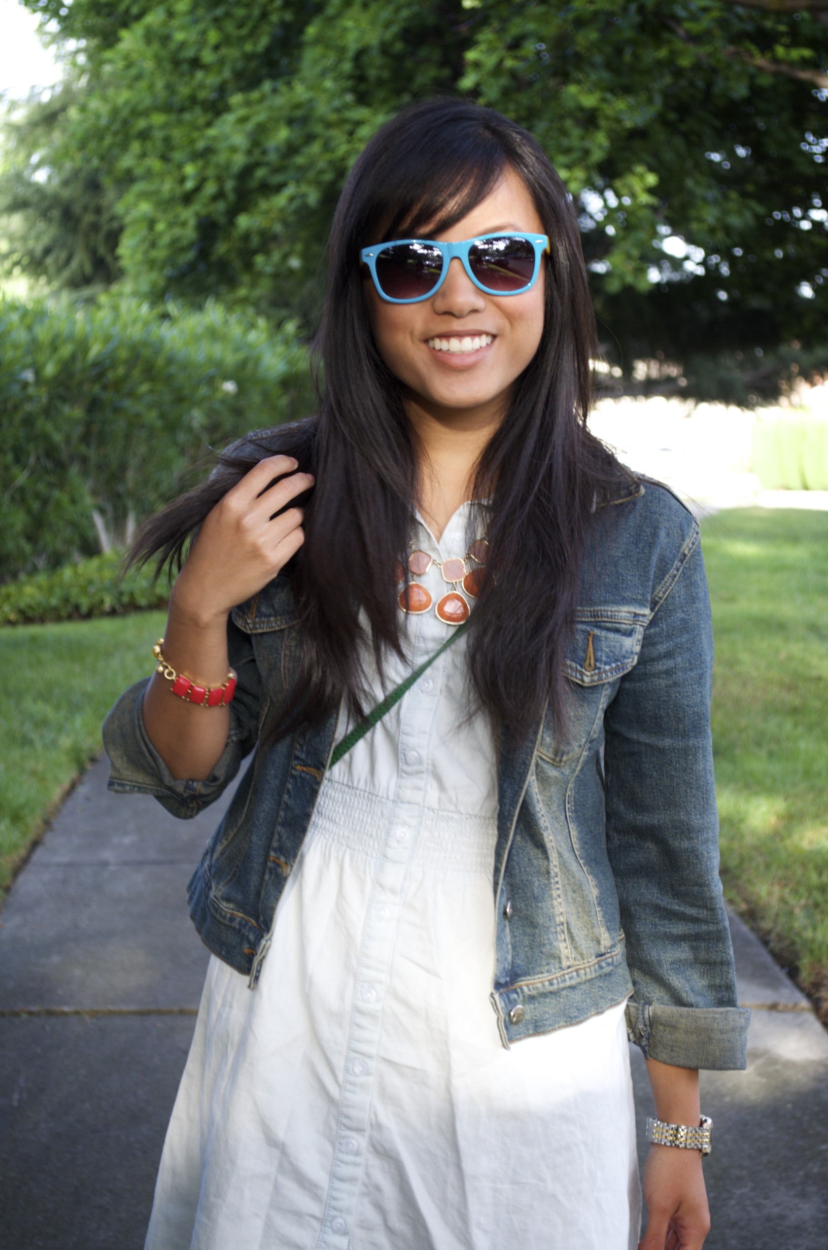 Your fun accessories really liven up a neutral dress. The whole look works well with the denim!