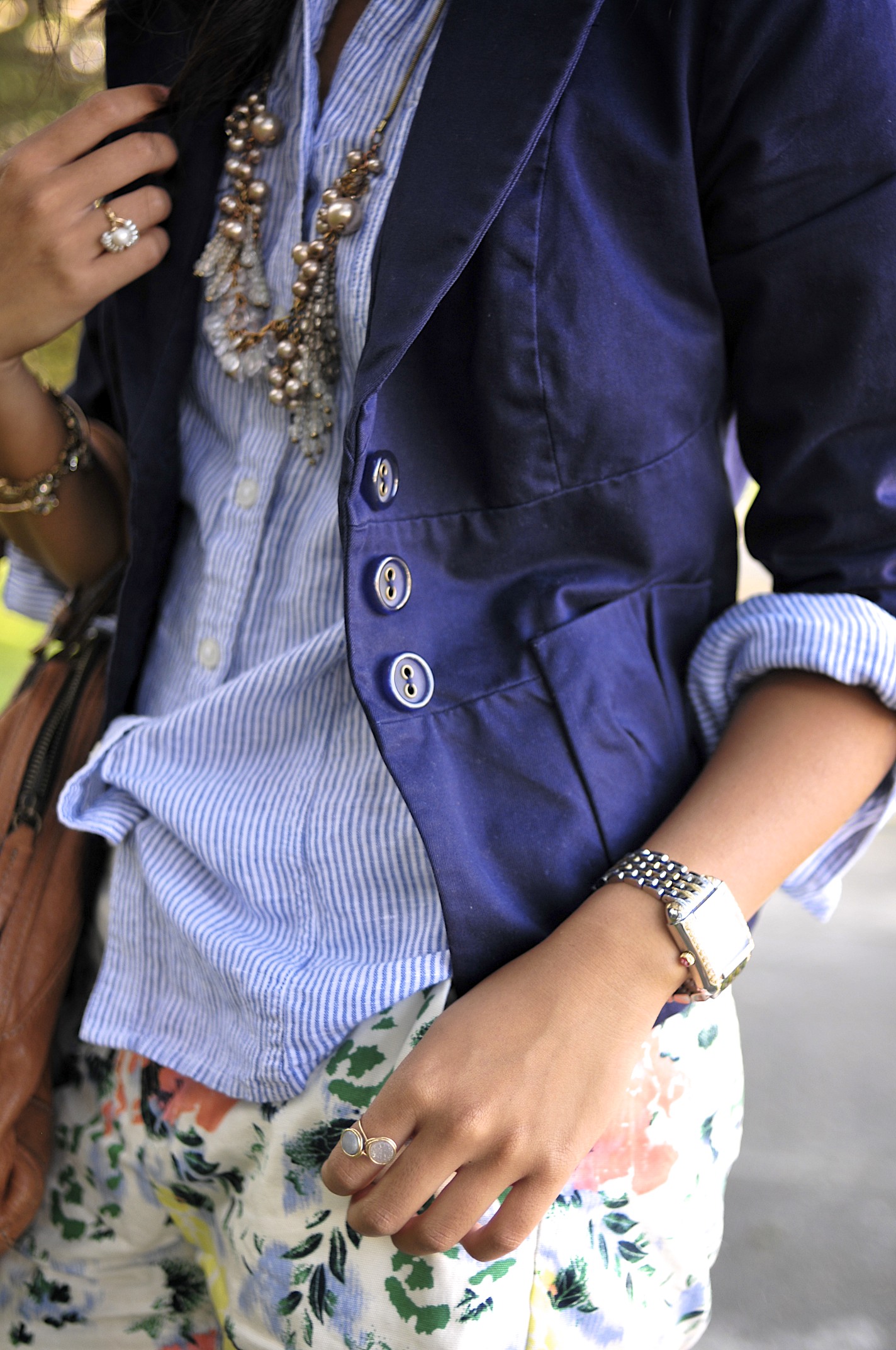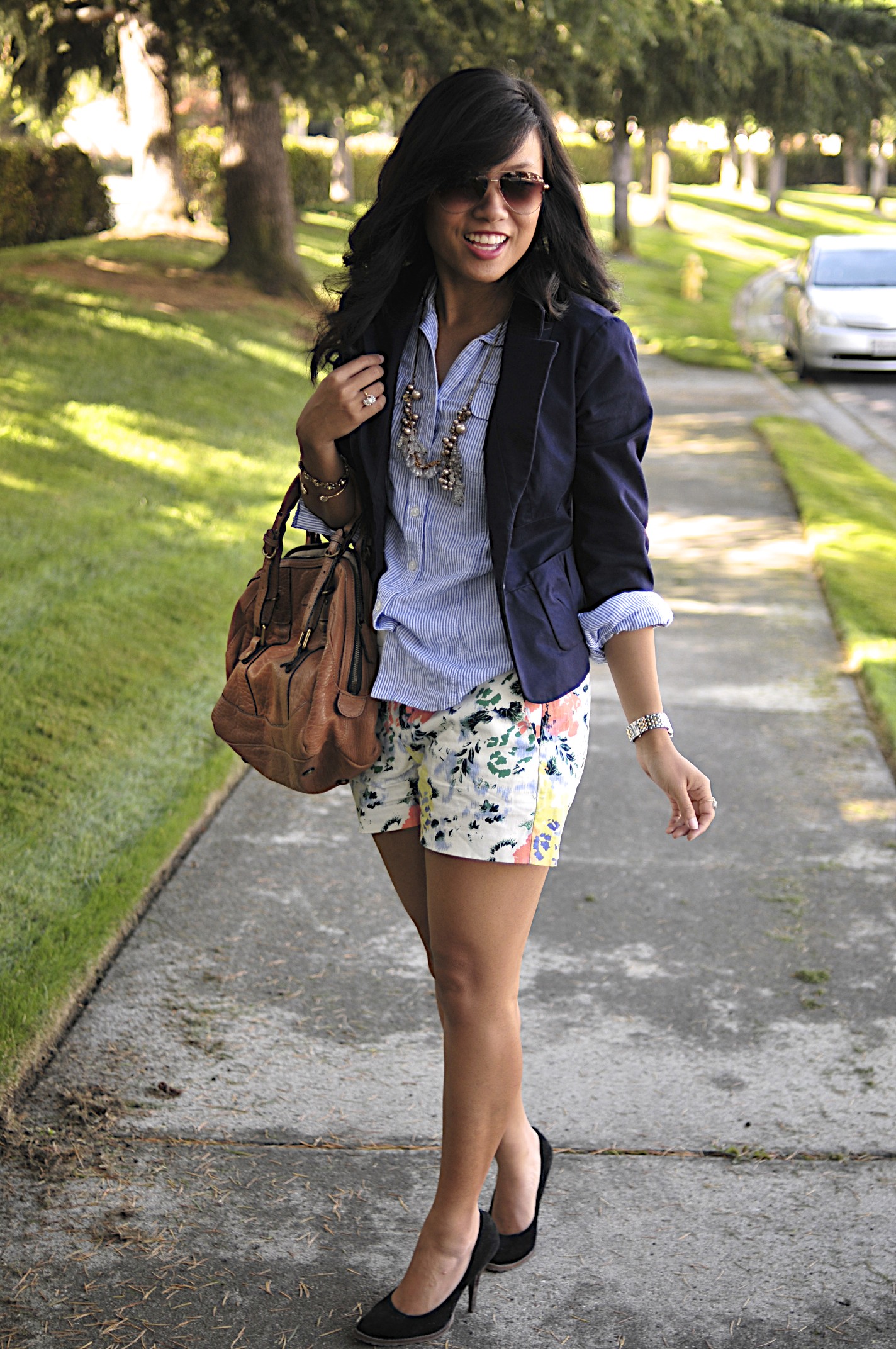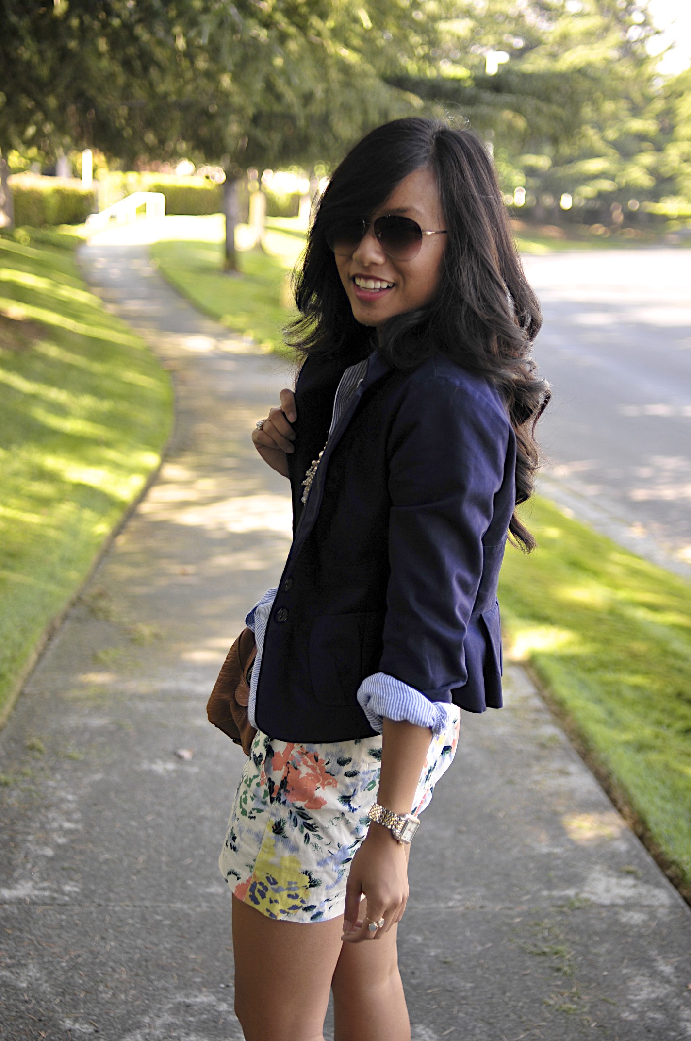 I found my floral shorts and this striped button-down and thought they would look good together. But to tone down the stripes, I decided to layer on an old cropped blazer to pull everything together.