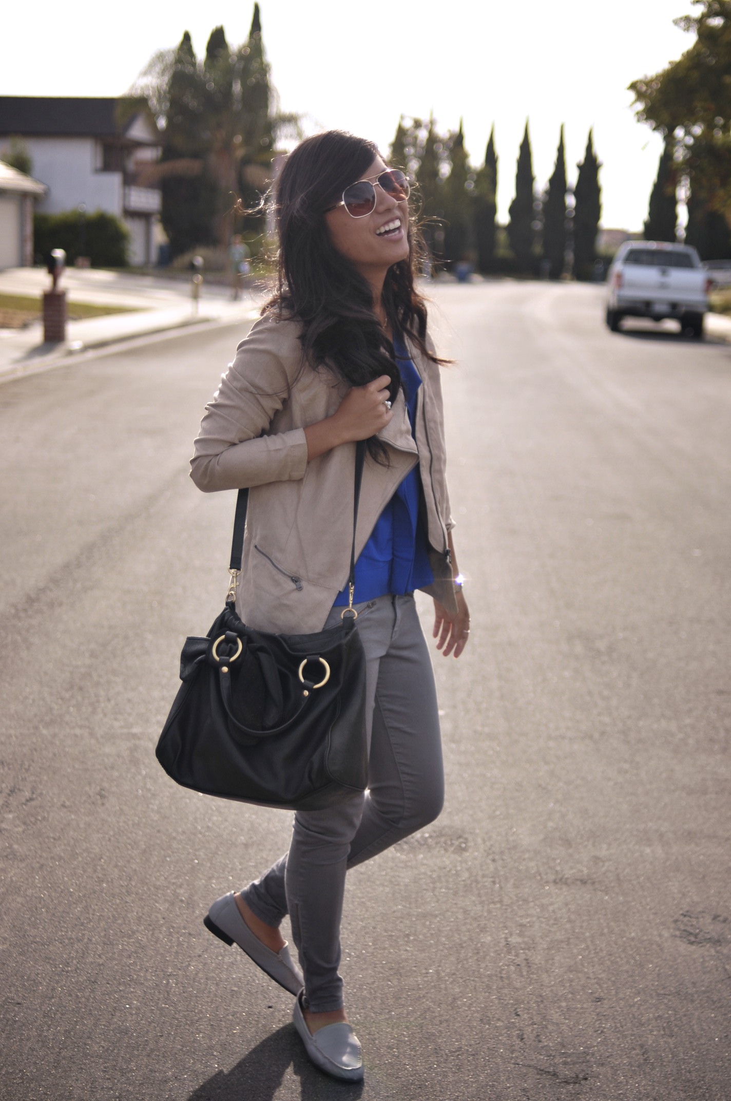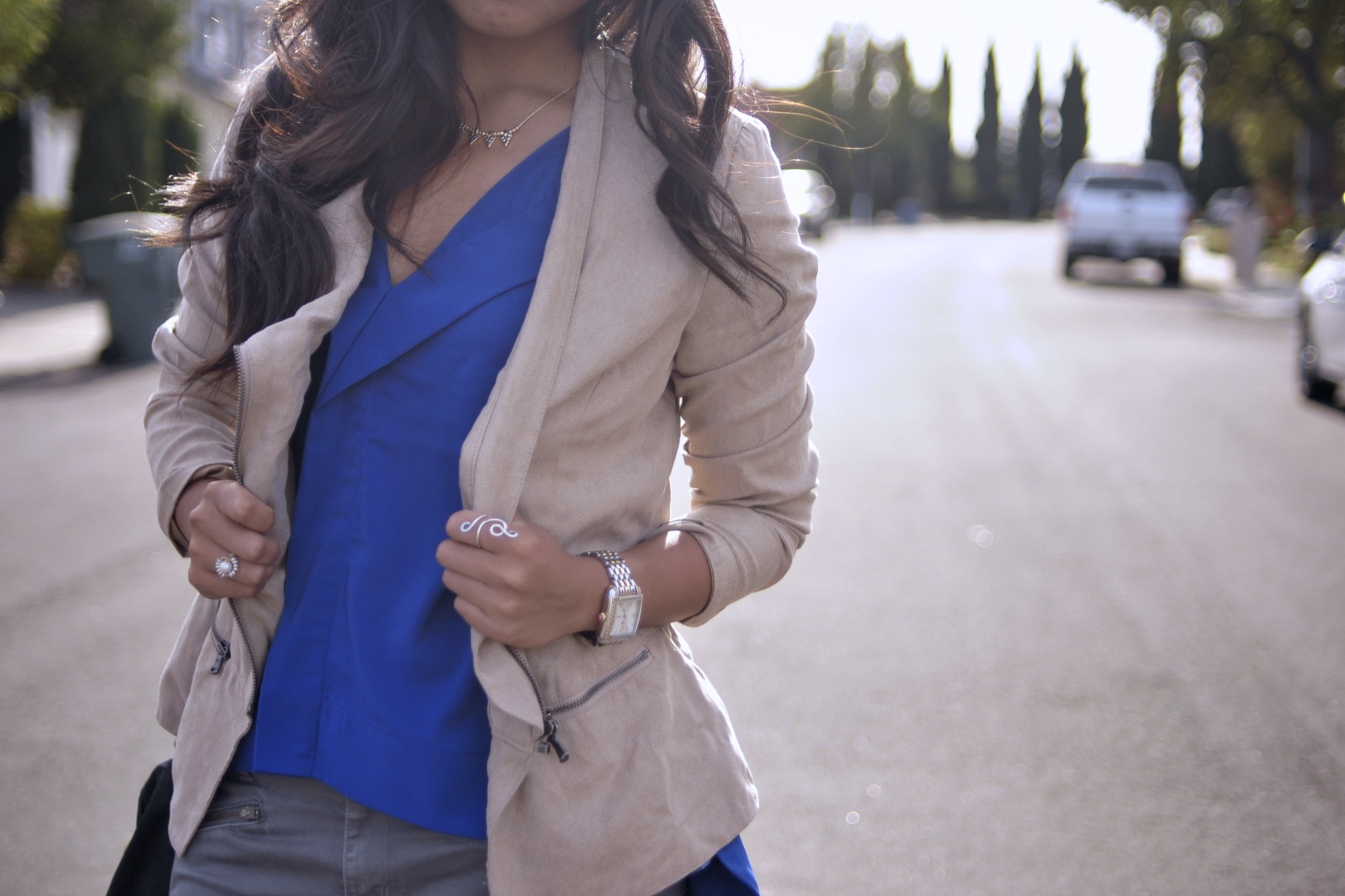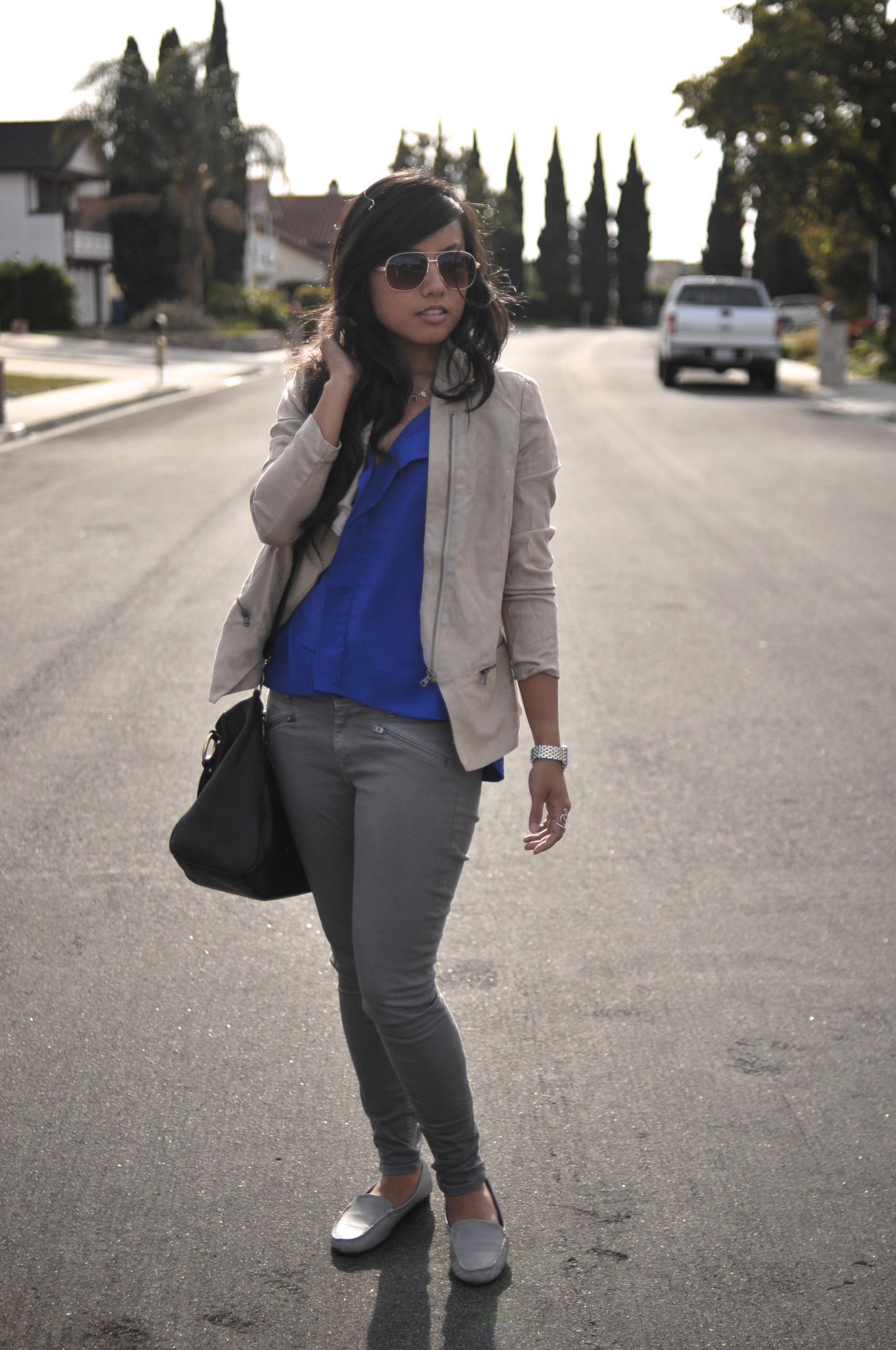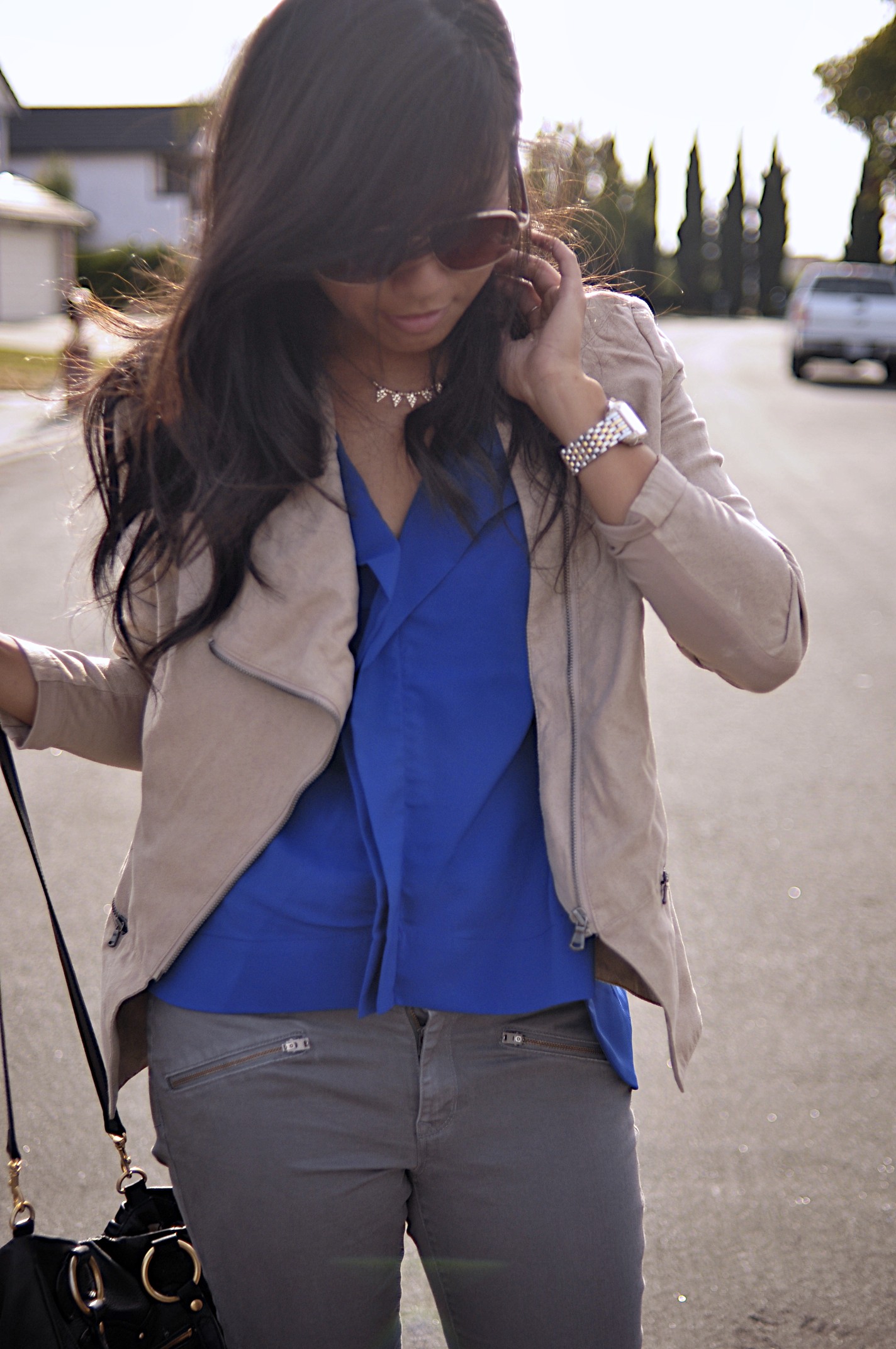 Top: c/o eShakti (last seen here) // Pants: Gap // Jacket: DKNY from Crossroads // Shoes: Naturalizer // Watch: Michele // Purse: Juicy Couture from Crossroads