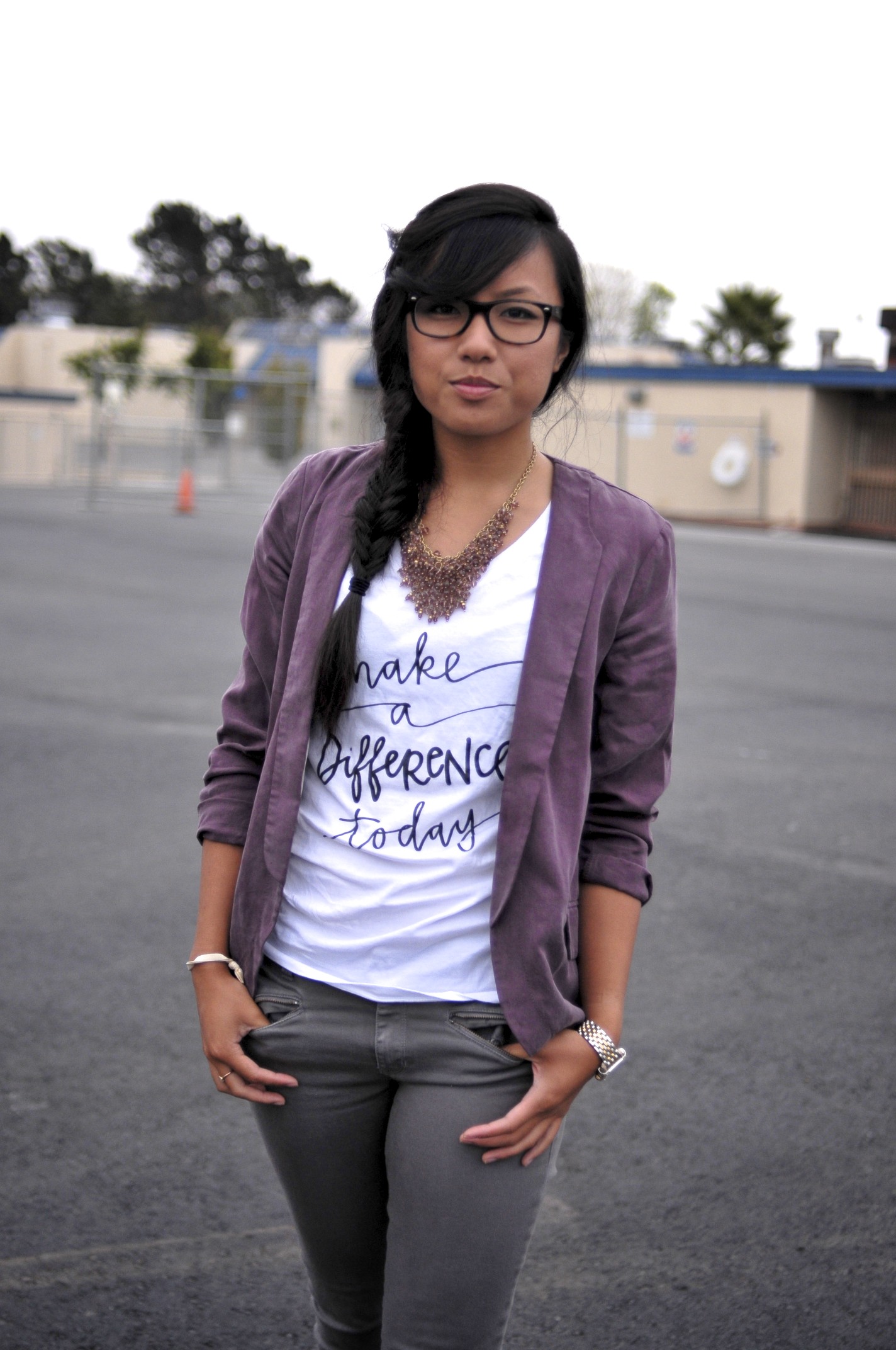 Blazer: Anthropologie – Similar {sale!} // Tee: “Make a Difference Today” c/o She Does Justice // Pants: Gap – Similar // Shoes: Talbots – Similar // Necklace: Talbots – Similar