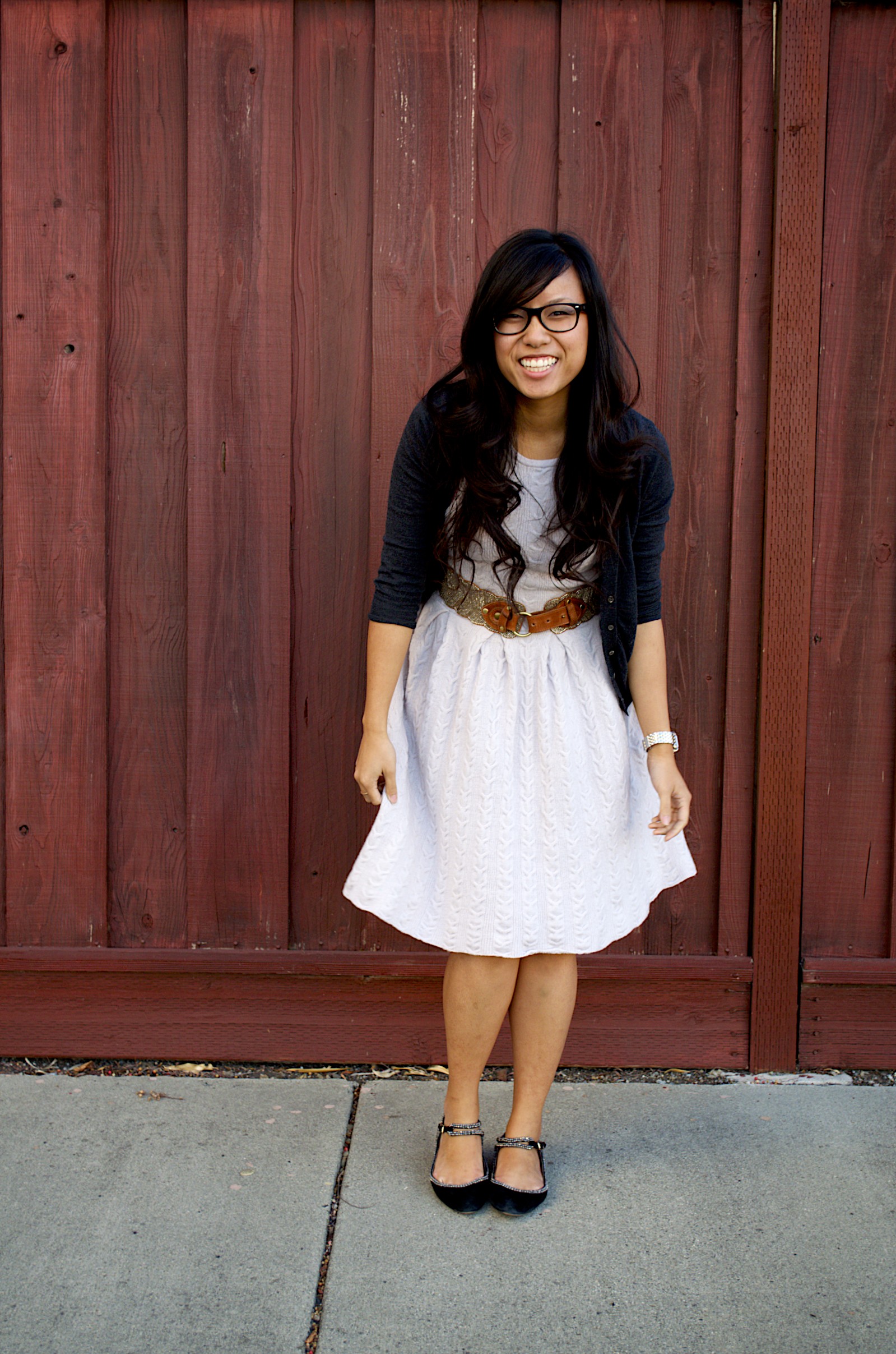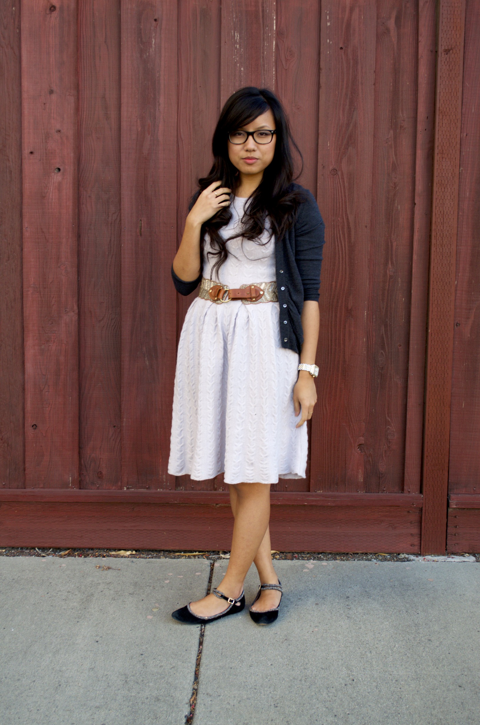So I’ve noticed that ZD is all about the A-line shape. So as I was rummaging through my aunt’s “don’t want this anymore” pile, I stumbled across this awesome sweater dress that totally reminded me of ZD. Pair it with a nice belt, cardigan, and my RayBans and you’ve got the look! And yes, technically I did not get this at a thrift store, but as my friend Kristi of Alligator Toe would say…it’s pre-thrifting. 🙂