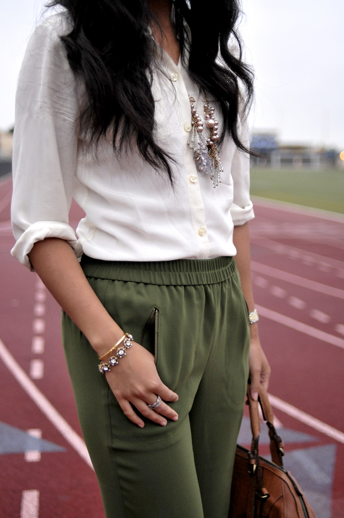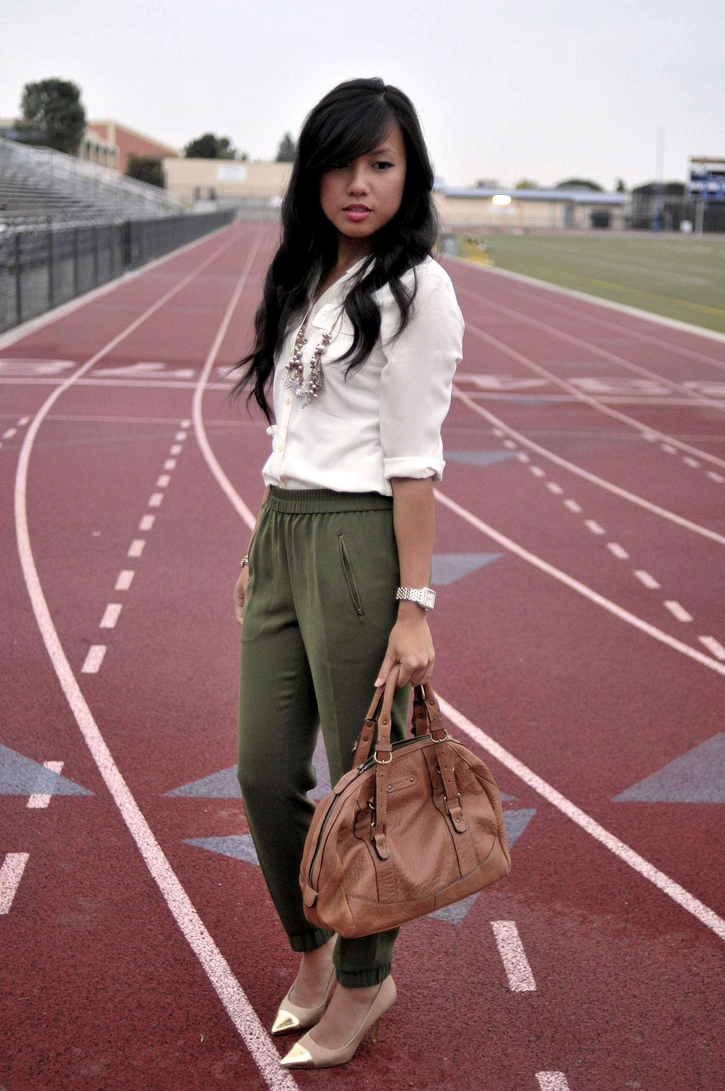 Blazer: Urban Outfitters – Similar (40% off!)// Crop Top: Anthropologie – Similar // Blouse: Talbots – Similar // Pants: Gap // Bag: The Bijou Rowan Tote c/o Ora Delphine // Shoes: Nicole Miller via DSW – Similar // Necklace and Bracelet: Talbots – Love this // Watch: Michele